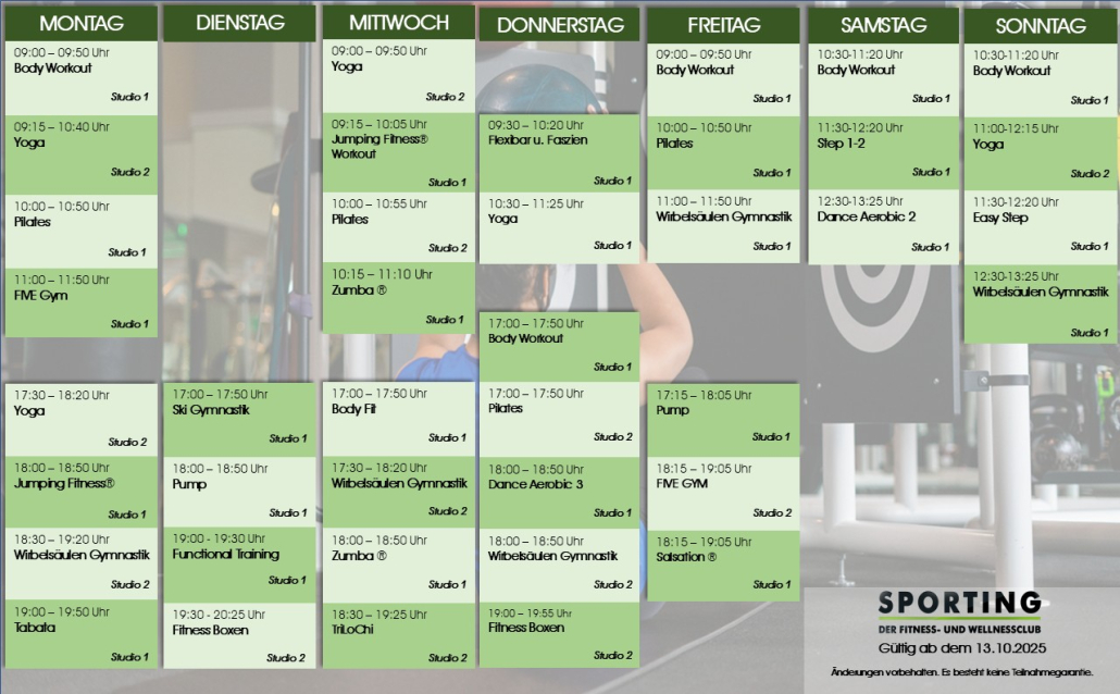 In 2 großen klimatisierten Studios bietet Ihnen Sporting Top Kurse an. Unsere qualifizierten Kursleiter motivieren Sie zu einem vielseitigen und effektiven Training. Spaß und gute Laune inklusive. Neueste Trends und Altbewährtes, für Jung und Alt, powern und relaxen, unser Group – Fitness – Angebot bietet für Jeden etwas.